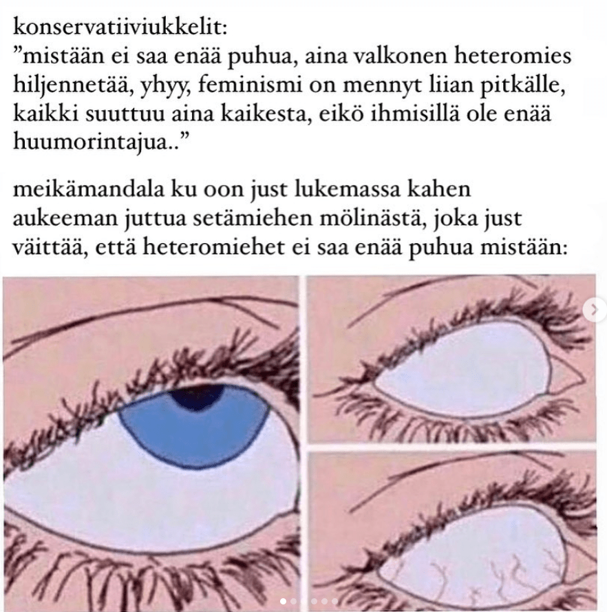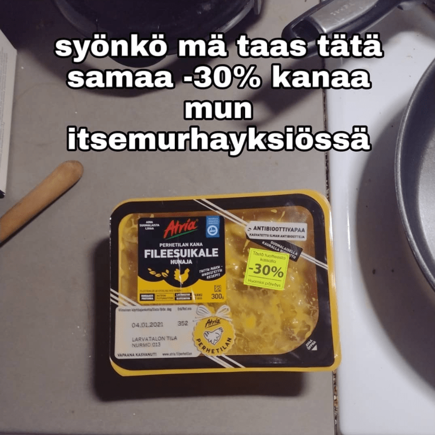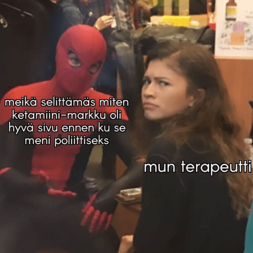 Jutussa käytetyt meemit ovat seuraavilta Instagram-tileiltä: @cledos_fani_ressu, @ketamiini_markun_meme_stash, @xtraorangecake, @kaikkipaskaksi