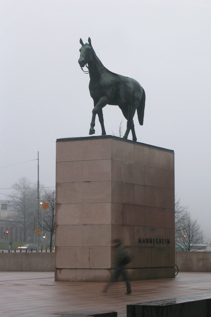 Kohottaessa katseensa katukiveystä pitkin kolisevasta keskioluttölkistä ja mystisesti vailla omistajaa lojuvista Black Horse -alushousuista, piirtyy nykytaiteenmuseo Kiasman remonttipressuja vasten uljas parivaljakko: rauhalliseen käyntiin jähmettynyt hevonen selässään karvalakki päässä patsasteleva äijänkäppänä. Hevosen selässä kuvattu entinen valtionpäämies kuuluu pitkään ja moninaiseen ratsastajapatsaiden perinteeseen.