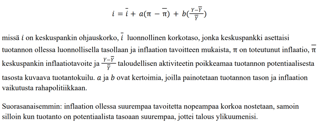 Keskuspankin korkopäätöksentekoa yksinkertaistamaan käytetään monilla makrotaloustieteen peruskursseilla ja monissa oppikirjoissa yhdysvaltalaiselta taloustieteilijä John Taylorilta nimensä saanutta Taylorin sääntöä (kaava jutun lopussa), jonka mukaan inflaation ollessa suurempaa tavoitetta nopeampaa korkoa nostetaan, samoin silloin kun tuotanto on potentiaalista tasoaan suurempaa, jottei talous ylikuumenisi.