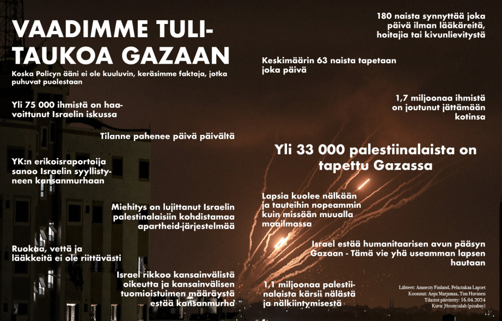 Kannanotto Kannanotto: Tulitauko Gazaan! Kirjoittanut policylehti on 6 toukokuun, 20244 toukokuun, 2024 Jaa tämä: Jaa Facebookissa(Avautuu uudessa ikkunassa) Facebook Click to share on X(Avautuu uudessa ikkunassa) X Jaa WhatsApp palvelussa(Avautuu uudessa ikkunassa) WhatsApp Jaa Pocket palvelussa(Avautuu uudessa ikkunassa) Pocket Julkaissut policylehti Näytä kaikki artikkelit kirjoittajalta policylehti