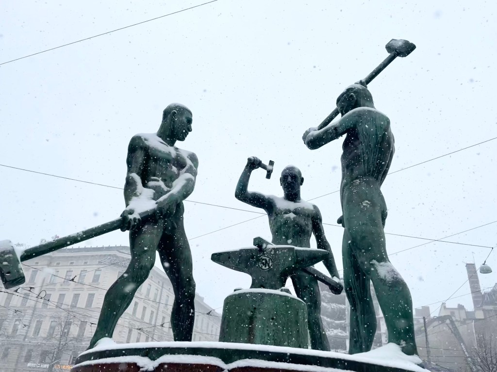 Lähes vaakasuoraan satava lumi piiskaa kasvojani, kun etsin viimeisen kuvauspäivän kohdetta Helsingin keskustassa. Varjostan hetken liilan sateenvarjon kanssa lumimyräkässä eteenpäin tarpovaa rouvaa, mutta en uskalla mennä niin lähelle, että kuvasta tulisi hyvä. Vaihdan kohteeksi viereisellä tiellä touhuavan lumiauran, jonka hukkaan ennen kuvausetäisyyksille pääsyä. Tuskallisen pitkän jahkailun jälkeen kohteeksi valikoituu lumipyryn yllättämä Kolmen sepän patsas. Lähetän kuvan Ylen säätoimitukseen, jonka osoitetta puhelimeni osaa jo automaattisesti ehdottaa jakamisnappia klikatessani.