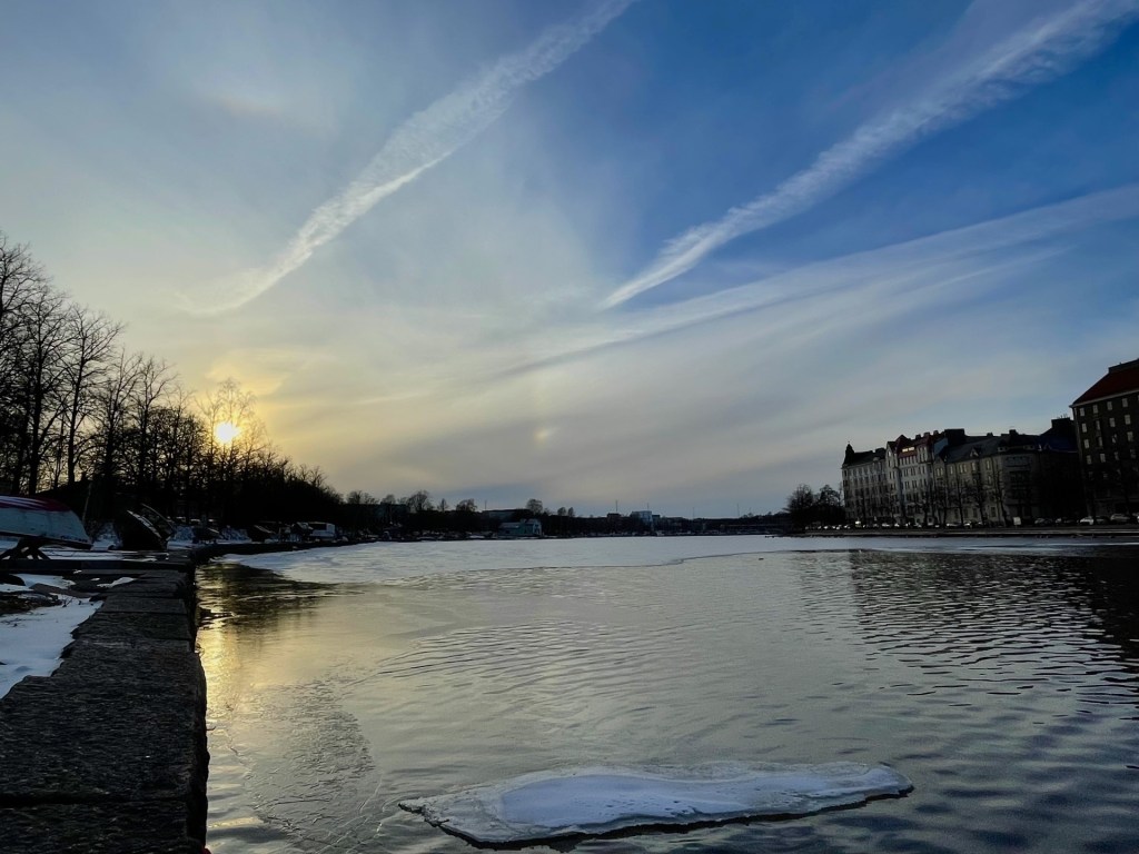 Lindfors vinkkaa, että tähän aikaan vuodesta hyvän kuvan voisi saada merenrannoilla sulavista jäämuodostelmista. Suuntaan siis Kaisaniemenlahdelle, jossa jääpeite on sulanut puoliksi pois ja vedenpinta heijastaa keltaisena ilta-auringon viimeisiä säteitä. Otan kuvan niin, että sen etualalle jää pieni jäälautta, joka toivon mukaan ohjaa katseet kuvan sisään. Muokattuani kuvaa Lindforsin neuvon mukaisesti lähetän sen Ylelle, vaikka kuvaspämmini on tässä vaiheessa mitä luultavimmin joko tulkittu palvelunestohyökkäykseksi tai ohjattu suoraan roskapostiin.