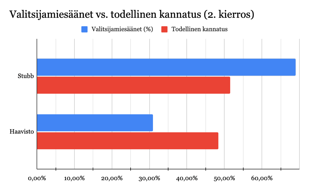 Siinä missä Alexander Stubb voitti todellisuudessa käydyn suoran kansanvaalin toisen kierroksen vain 3,2 prosenttiyksikön kaulalla, enemmistövaalein käytynä asetelma olisi ollut hyvin toisenlainen: Stubb olisi saanut taakseen huikeat 156 valitsijamiestä, kun taas Pekka Haavisto vain 70. Tämä havainnollistaa hyvin sen, miten prosentuaalisesti pieni kannatusero voi venähtää hyvinkin dramaattiseksi enemmistövaalitapaan nojaavassa valitsijamiesjärjestelmässä. Suomen presidentinvaaleissa 2024 se ei olisi riittänyt kääntämään asetelmaa sellaiseksi, että suoran kansanvaalin hävinnyt ehdokas olisi vienyt voiton. Kuten kaikki luultavasti tietävät, tämä ei Yhdysvalloissa etenkään 2000-luvun aikana ole ollut tavatonta.