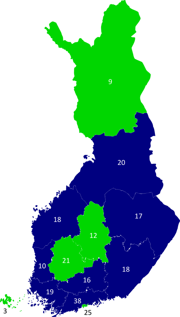 Seuraavaksi tulee laskea, kuinka monta valitsijamiestä kukin Suomen ”osavaltio” saisi. Kuten mainittua, edustajainhuoneen paikat jaetaan asukasluvun perusteella käyttäen Huntingtonin–Hillin laskukaavaa. Koska Yhdysvalloissa ei ole yleistä väestörekisterijärjestelmää, kongressin alahuoneen alueelliset voimasuhteet määritetään uudelleen joka kymmenes vuosi toteutettavan väestönlaskennan perusteella. Viimeisin tällainen väestönlaskenta toteutettiin koronavuonna 2020. Tästä syystä laskemme myös Suomen hypoteettisen edustajainhuoneen alueelliset voimasuhteet joulukuun 2020 väestötietojen perusteella. Kun tähän lasketaan mukaan senaattorien määrän perusteella annettavat valitsijamiehet, valitsijamiehet jakautuvat seuraavasti: