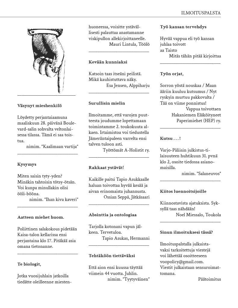Ilmoituspalstalla julkaistavaksi tarkoitettuja viestejä voi lähettää osoitteeseen voopolicy@gmail.com. Viestit julkaistaan sensuroimattomana.